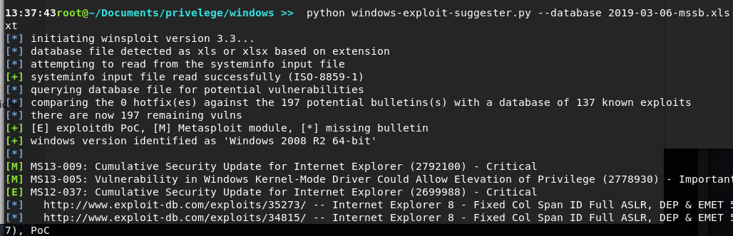 | wget http: python windows-exploit-suggester.py --update python windows-exploit-suggester.py --database 2019-03-06-mssb.xls --systeminfo sys.txt