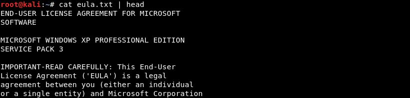 (从上述结果看),获得整个系统的读写权限似乎是可行的。由于llisence.rtf文件只有在早于Windows 7的操作系统下才能隐藏,在查看了eula.txt文件后我们可以得知操作系统是 Windows XP Service Pack 3。