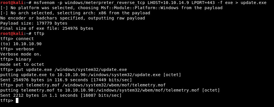 TFTP 的 binary(二进制)传输模式是可用的,在MOF文件被上传到 “c:\windows\system32\wbem\mof ”之前,该MOF文件需要先上传到“c:\windows\system32”。