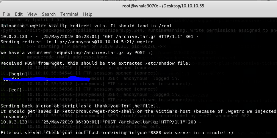 稍等两分钟,10.10.10.55的shell就会返回执行结果,成功获得10.10.3.133的/root/root.txt文件。