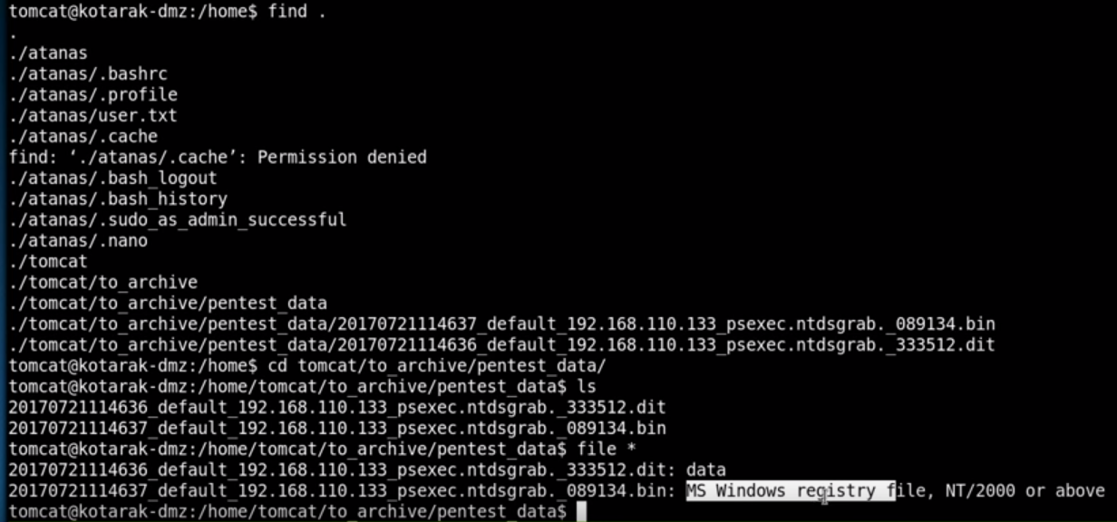 在用户家目录下,发现一个ntds.dit文件。以前没做过域渗透,(⊙﹏⊙)稍微去了解了下,ntds.dit即目录数据库,用于windows域。