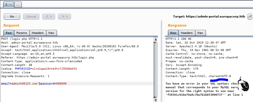 email=admin@europacorp.htb‘ or ‘1’=’1&password=098098