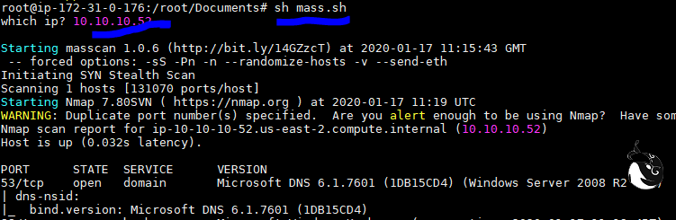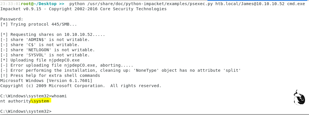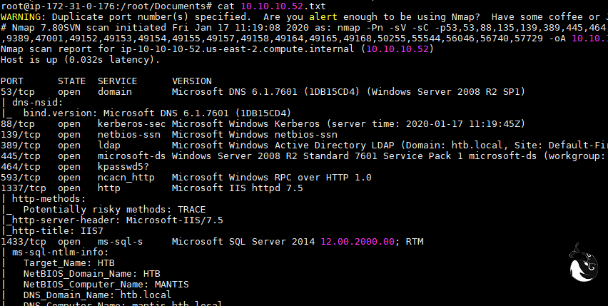 53/tcp open domain Microsoft DNS 6.1.7601 (1DB15CD4) (Windows Server 2008 R2 SP1) | dns-nsid: |_ bind.version: Microsoft DNS 6.1.7601 (1DB15CD4) 88/tcp open kerberos-sec Microsoft Windows Kerberos (server time:2020-01-1711:19:45Z) 139/tcp open netbios-ssn Microsoft Windows netbios-ssn 389/tcp open ldap Microsoft Windows Active Directory LDAP (Domain: htb.local, Site: Default-First-Site-Name) 445/tcp open microsoft-ds Windows Server 2008 R2 Standard 7601 Service Pack 1 microsoft-ds (workgroup: HTB) 464/tcp open kpasswd5? 593/tcp open ncacn_http Microsoft Windows RPC over HTTP 1.0 1337/tcp open http Microsoft IIS httpd 7.5 | http-methods: |_ Potentially risky methods: TRACE |_http-server-header: Microsoft-IIS/7.5 1433/tcp open ms-sql-s Microsoft SQL Server 201412.00.2000.00; RTM | ms-sql-ntlm-info: | Target_Name: HTB | NetBIOS_Domain_Name: HTB | NetBIOS_Computer_Name: MANTIS | DNS_Domain_Name: htb.local | DNS_Computer_Name: mantis.htb.local | DNS_Tree_Name: htb.local |_ Product_Version:6.1.7601 | ssl-cert:Subject: commonName=SSL_Self_Signed_Fallback | Not valid before:2020-01-17T09:04:27 |_Not valid after:2050-01-17T09:04:27 3268/tcp open ldap Microsoft Windows Active Directory LDAP (Domain: htb.local, Site: Default-First-Site-Name) 8080/tcp open http Microsoft HTTPAPI httpd 2.0 (SSDP/UPnP) |_http-open-proxy: Proxy might be redirecting requests |_http-server-header: Microsoft-IIS/7.5 9389/tcp open mc-nmf .NET Message Framing 47001/tcp open http Microsoft HTTPAPI httpd 2.0 (SSDP/UPnP) |_http-server-header: Microsoft-HTTPAPI/2.0 49157/tcp open ncacn_http Microsoft Windows RPC over HTTP 1.0 50255/tcp open ms-sql-s Microsoft SQL Server 201412.00.2000 | ms-sql-ntlm-info: | Target_Name: HTB | NetBIOS_Domain_Name: HTB | NetBIOS_Computer_Name: MANTIS | DNS_Domain_Name: htb.local | DNS_Computer_Name: mantis.htb.local | DNS_Tree_Name: htb.local |_ Product_Version:6.1.7601 | ssl-cert:Subject: commonName=SSL_Self_Signed_Fallback | Not valid before:2020-01-17T09:04:27 |_Not valid after:2050-01-17T09:04:27 Service Info:Host: MANTIS; OS: Windows; CPE: cpe:/o:microsoft:windows_server_2008:r2:sp1, cpe:/o:microsoft:windows