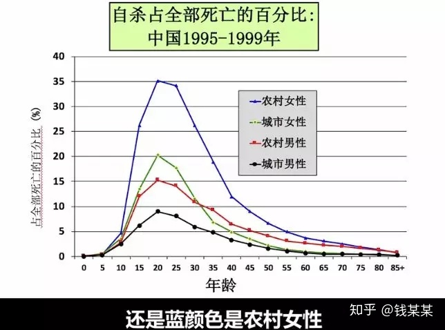 农村女性在20~30岁的自杀人数,是农村男性自杀的2倍以上,接近于城市男性自杀的4倍