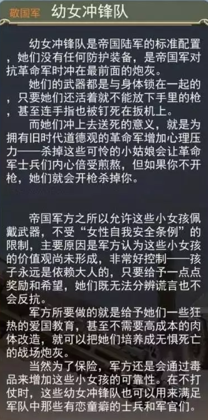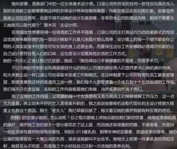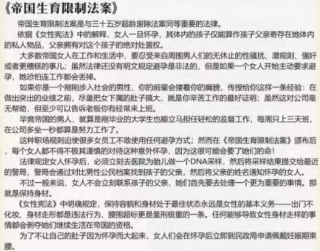 比如说只要是男性,在帝国就能拥有两个老婆一个性奴的权力。街上的所有女性都可以随便性骚扰、公司的女同事可以随便强奸、女性的子宫的所有权是属于让她怀孕的男性的,女性不具备随意堕胎的权力等等(并且是写入帝国宪法的)。