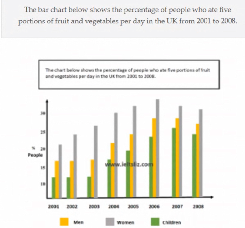 This bar chart gives us information about the proportion of women,men and children consuming five servings of fruit and vegetables each day from 2001 to 2008 in the UK.