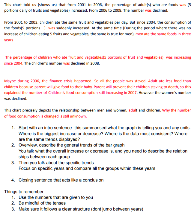 This chart told us that from 2001 to 2006, the percentage of adult who ate foods was increased. From 2006 to 2008, The number was declined. The percentage of children who ate fruit and vegetables was increasing since 2004. The children’s number was declined in 2008.