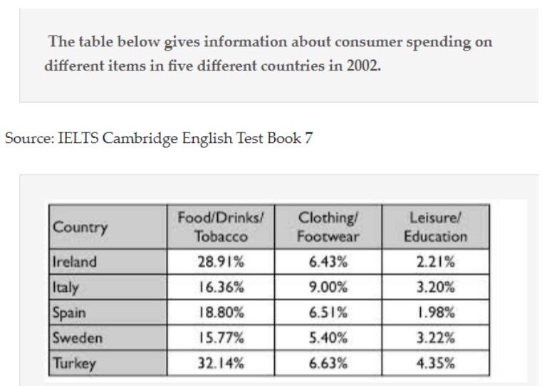 In conclusion, the table provides precise percentages of consumer spending on different items in Ireland, Italy, Spain, Sweden, and Turkey.