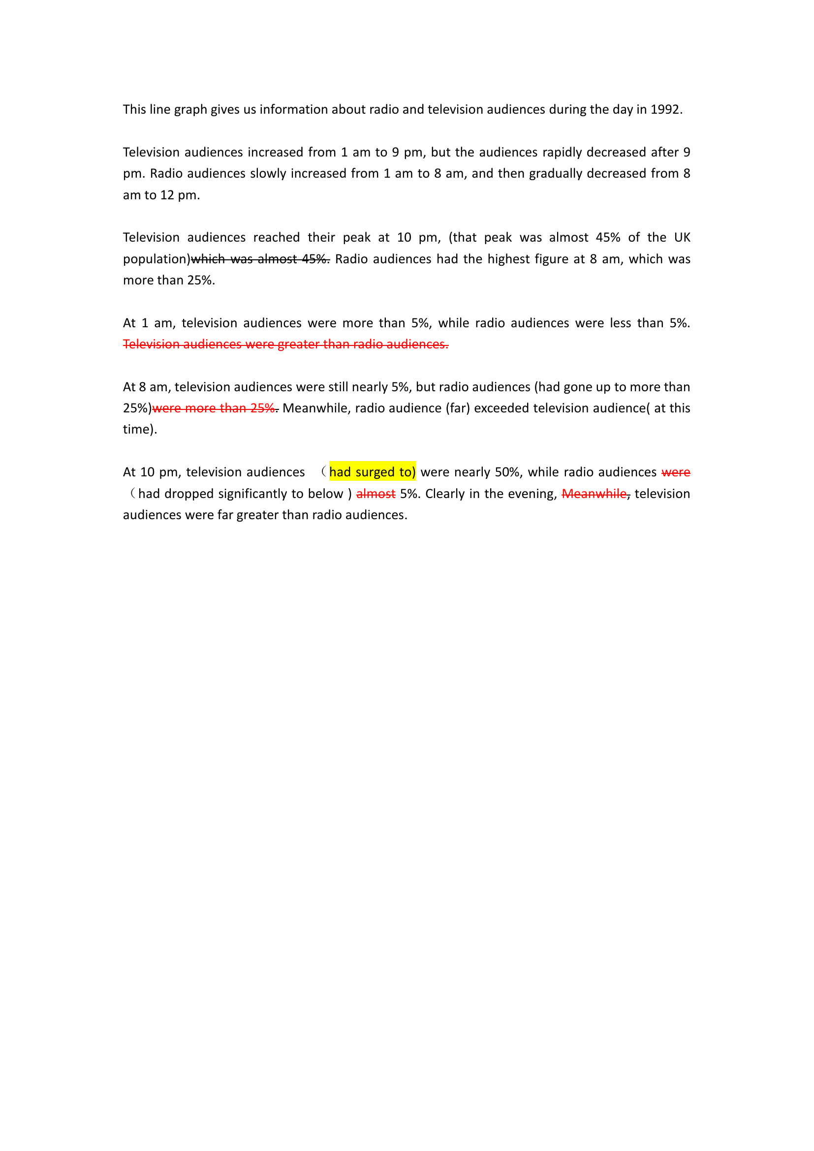 - “televisions audiences were more than radio audiences” 应改为 “television audiences were greater than radio audiences”,更准确地表达了两者之间的关系。