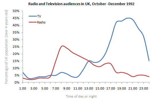 This line graph gives us information about radio and television audiences during the day in 1992.