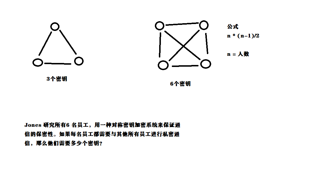 所以,他们需要15个密钥来保证这6名员工之间的私密通信的保密性。每对员工都需要一个密钥,因此总共需要15个密钥。