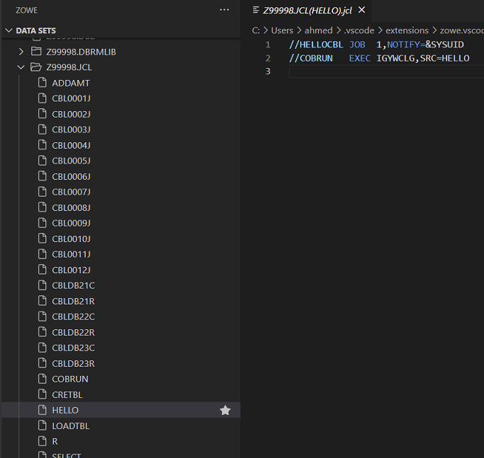 zowe.config.json和zowe.schema.json) 从 LearnCOBOL 文件夹移动到 Zowe 的全局位置。默认情况下,Windows 为C:\Users\%USERNAME%\.zowe,Linux 和 macOS 为~/.zowe。以下网址是另一份优秀的文档,描述了上述 VS Code 和 Zowe Explorer 的详细信息和示例:https://marketplace.visualstudio.com/items?itemName=Zowe.vscode-extension-for-zowe