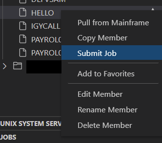 <用户名>.JCL右键单击 JCL 成员 HELLO。会出现一个选项框。选择 Submit Job,系统将处理 HELLO JCL,如图 20 所示。提交的 JCL 作业会编译 COBOL HELLO 源代码,然后执行 COBOL HELLO 程序。