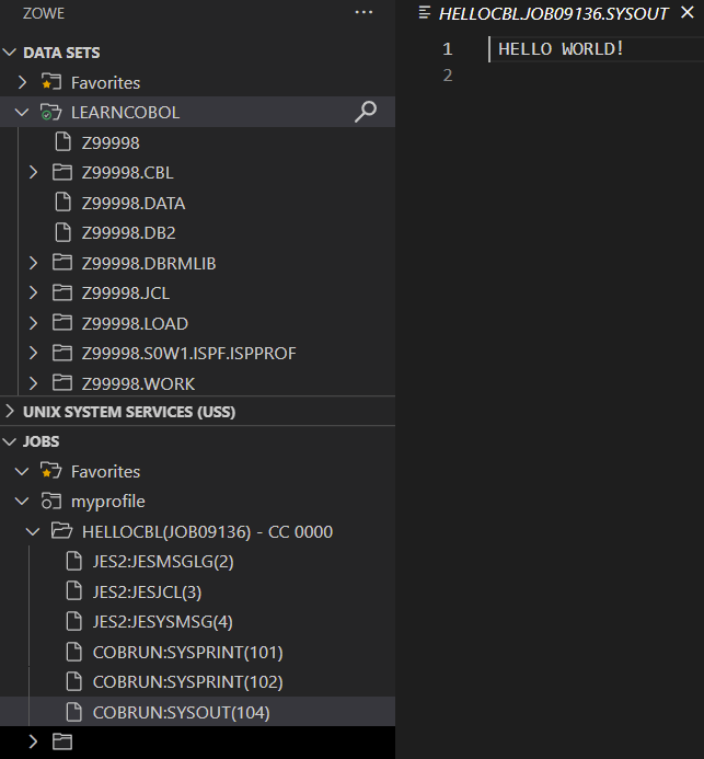 通过从 Zowe Explorer 的 LEARNCOBOL 中的 Jobs 部分选择 COBRUN:SYSOUT(104) 查看 COBOL 程序的执行,如图 25 所示。