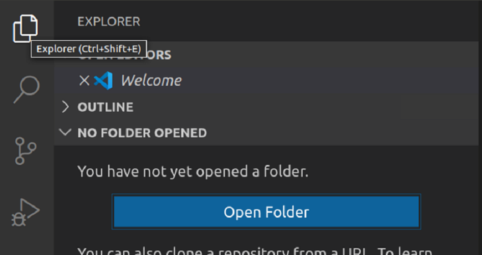 现在回到您的 VS Code 窗口,选择“Explorer”选项卡,然后按左侧栏中的“打开文件夹”按钮。