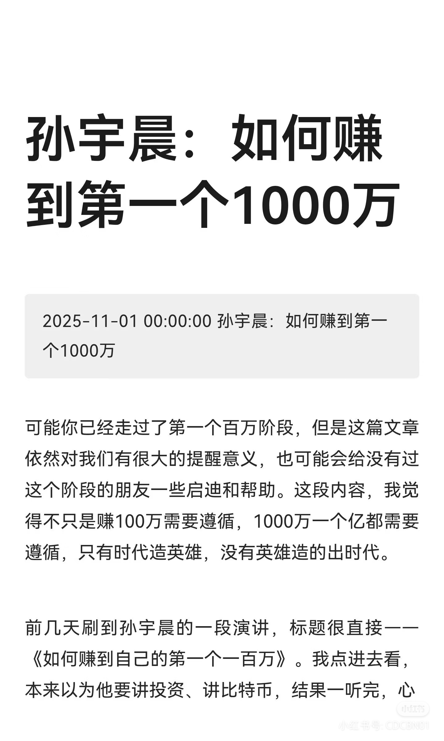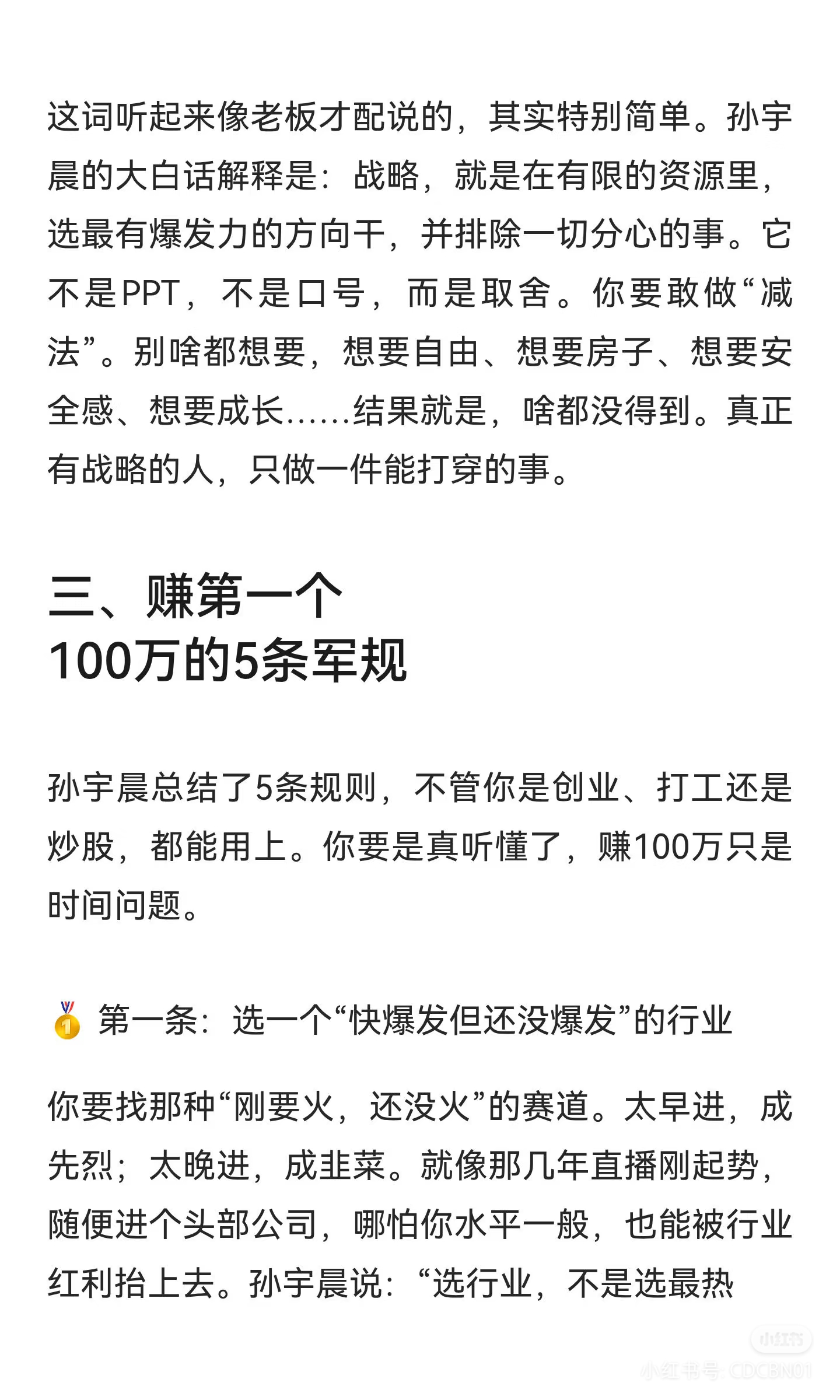 孙宇晨说,赚第一个100万的5条军规。第一,选一个即将爆发或者临近爆发的行业,这样才能吃到行业的红利。 第二,找一个高速增长的企业公司,比如以20%的速度连续增长10年。