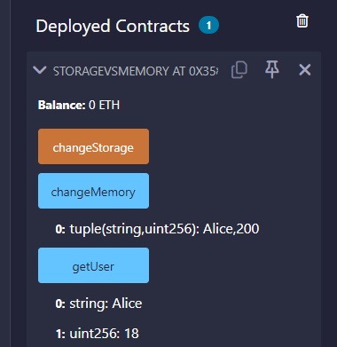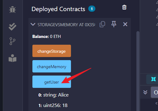 测试 点击changeMemory,返回[call]from: 0x5B38Da6a701c568545dCfcB03FcB875f56beddC4to: StorageVsMemory.changeMemory()data: 0x92e…32b11 ,decoded_output等于{ “0”: “tuple(string,uint256): Alice,200” }