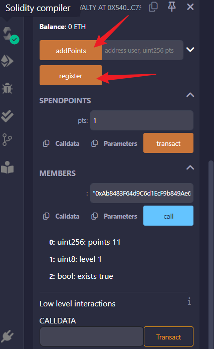contract LoyaltySystem { struct Member { uint256 points; uint8 level; bool exists; }
