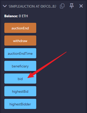 bid()函数中,用户需要发送一定量的 ETH 才能进行竞标。因为 Remix IDE 中的红色按钮是关联到交易(需要支付以太币)的函数,因此它被标记为红色。 - 具体来说,当你点击 红色的