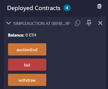 withdraw():这是一个允许竞标者取回多余出价的函数。此函数也不需要发送 ETH(它是一个仅返回资金的函数),所以 Remix 给它标上了黄色按钮。