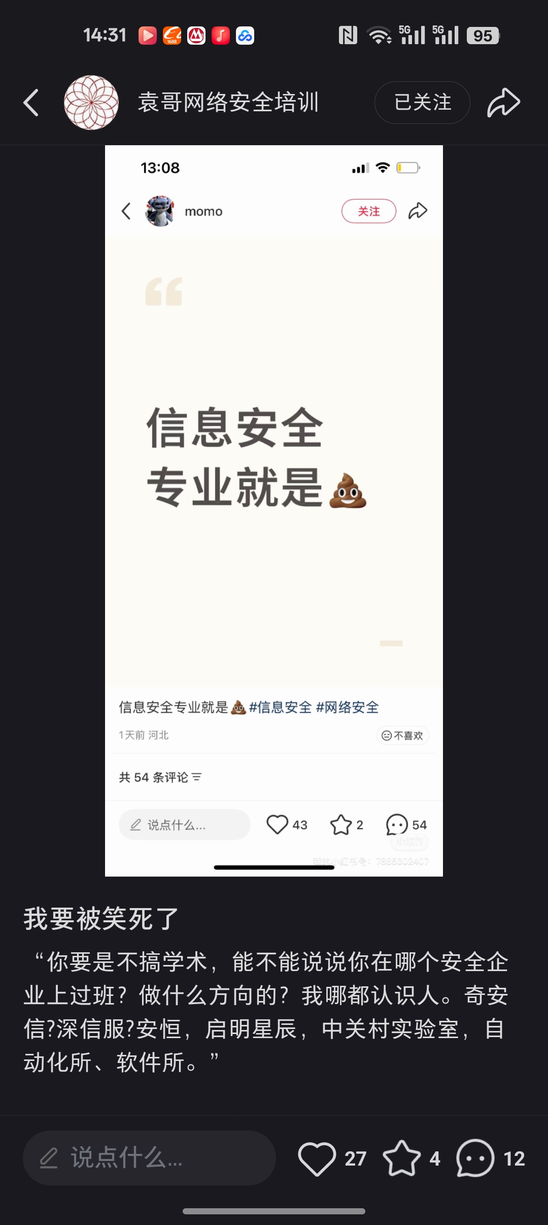 有一个有数十年网安经验,id叫做袁哥,yuange的人,就公开说,是人不行,而不是专业不行。