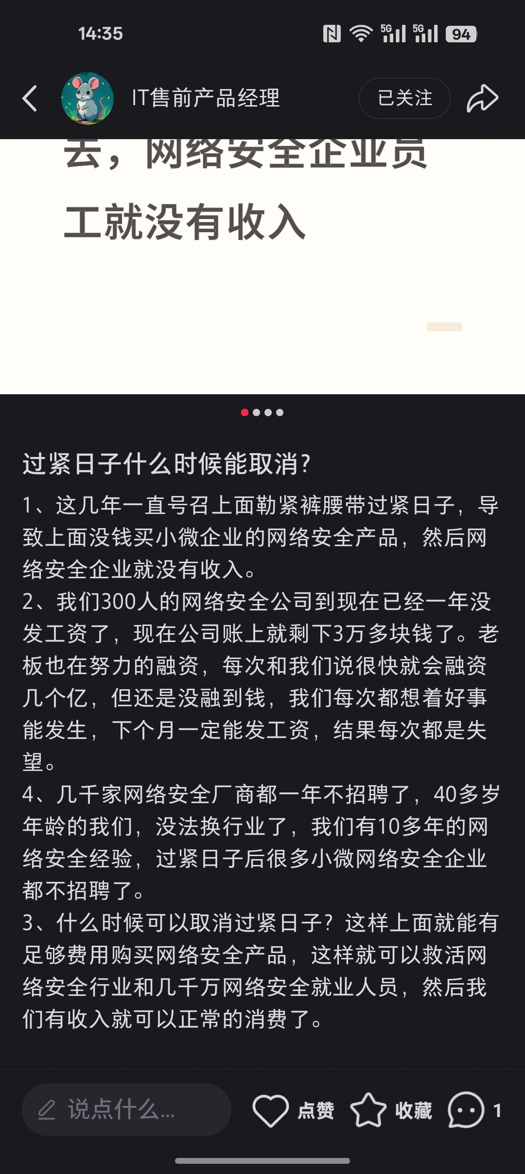 现在网络安全行业陷入到低价内卷,从头部到底层公司,破产的破产,倒闭的倒闭,发不出工资。