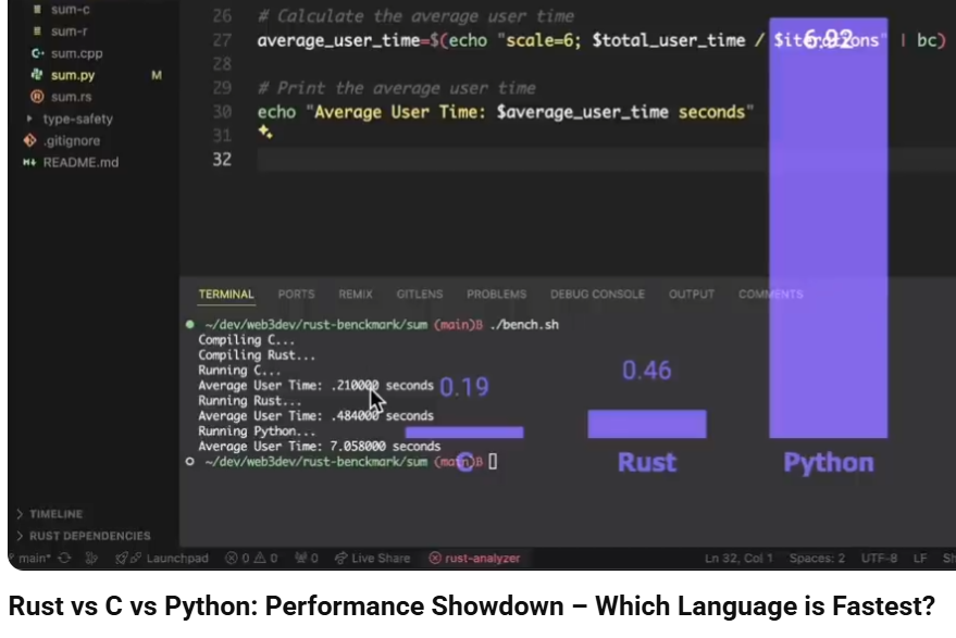 这个视频通过具体的数组求和测试,直观展示了 Rust 和 C 在性能上如何并驾齐驱,并拉开 Python 巨大的差距,非常符合你对“生存力”和“性能效率”的关注。
