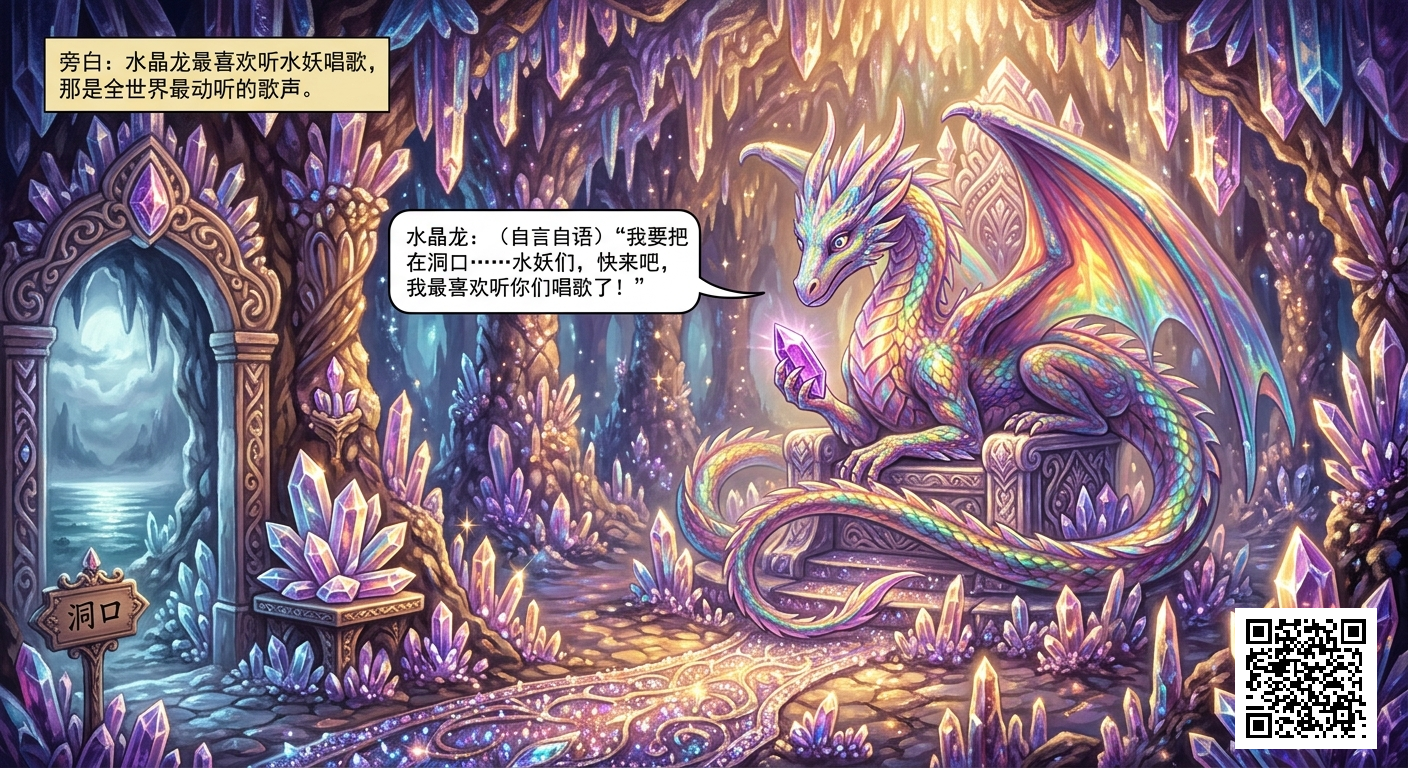 - 水晶龙: (自言自语)“我要把这些水晶放在洞口……水妖们,快来吧,我最喜欢听你们唱歌了!”